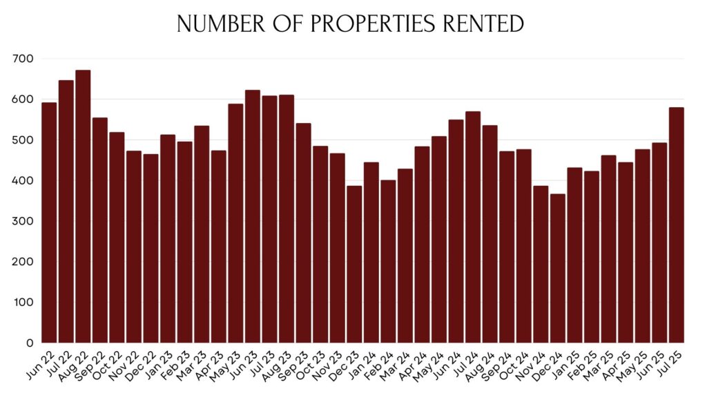 In July, rental volume hit 580, the highest number since August 2023. Median price in July was up from last year but down slightly from June. Properties rented in the same amount of time as in June but 4 days faster than last July. As of 8/26, there are 622 properties available for long-term rent on Oahu, down 3.5% from last month.